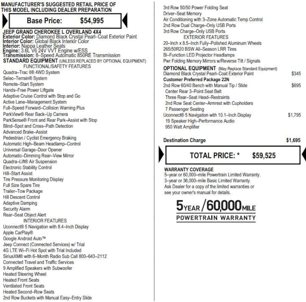 RADIO: UCONNECT 5 NAV W/10.1" DISPLAY premium 19 speaker McIntosh audio system, 10.1" Touchscreen Display, 19 Speakers High Performance Audio, 950 Watt Amplifier, 2ND ROW 60/40 BENCH W/MANUAL TIP/SLIDE 3 Rear Seat Head Restraints, Center Rear 3-Point Seat Belt, 7 Passenger Seating, 2nd Row Seat Center Armrest/Cupholders, TRANSMISSION: 8-SPEED AUTOMATIC (850RE) (STD), ENGINE: 3.6L V6 24V VVT UPG I W/ESS (STD).